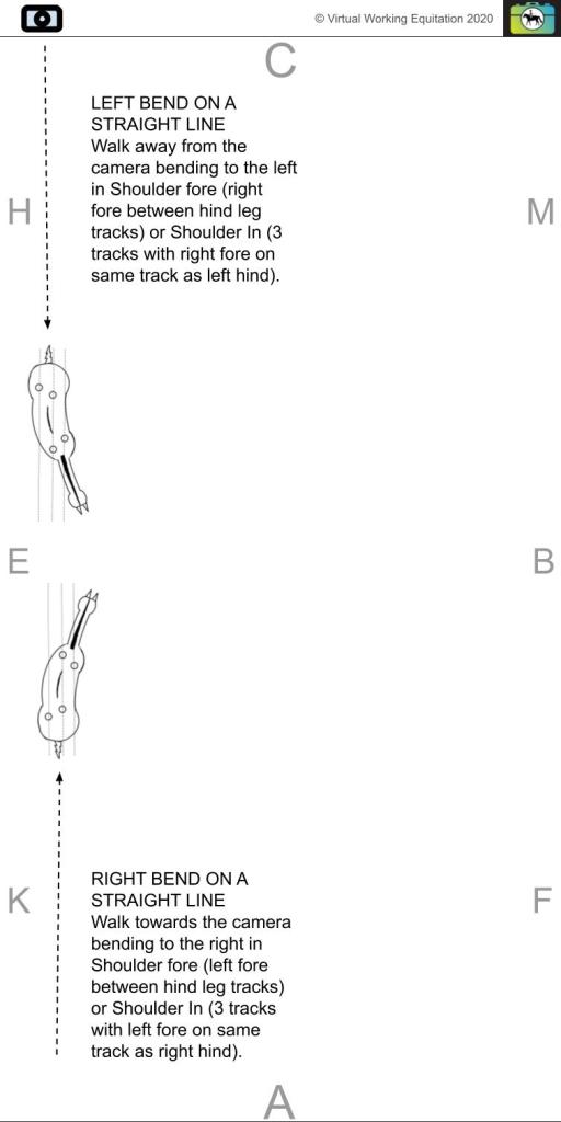 Walk down the edge of the wall (or poles used to create an edge) bending to the left in Shoulder fore (right fore between hind leg tracks) or Shoulder In (3 tracks with right fore on same track as left hind).